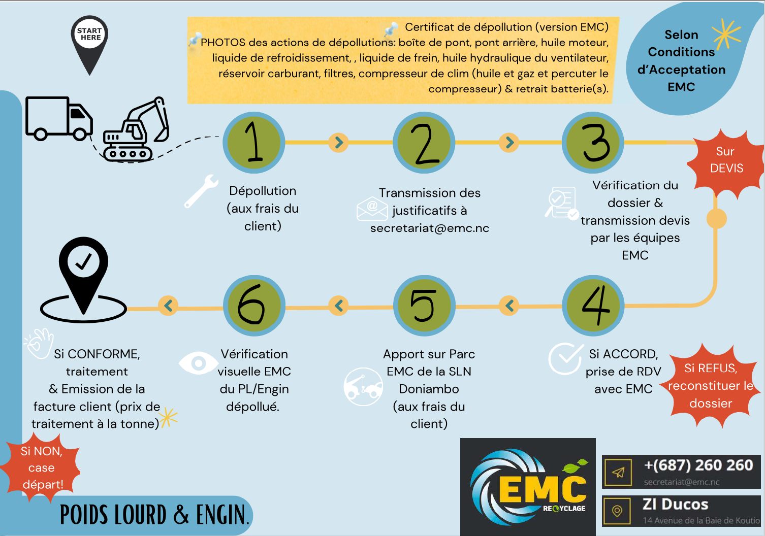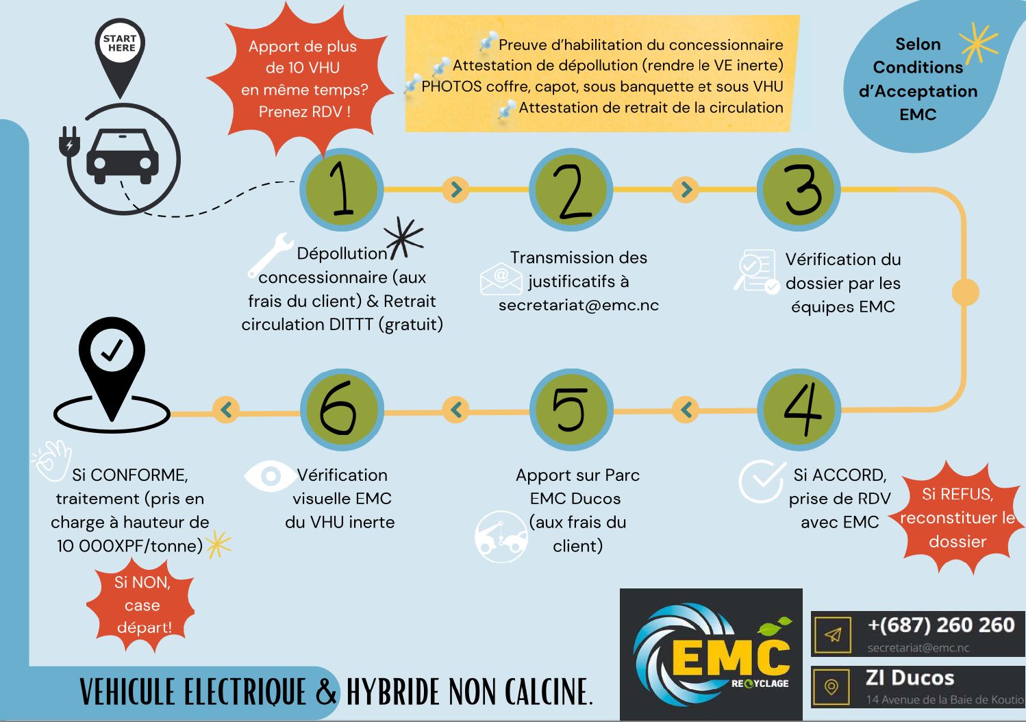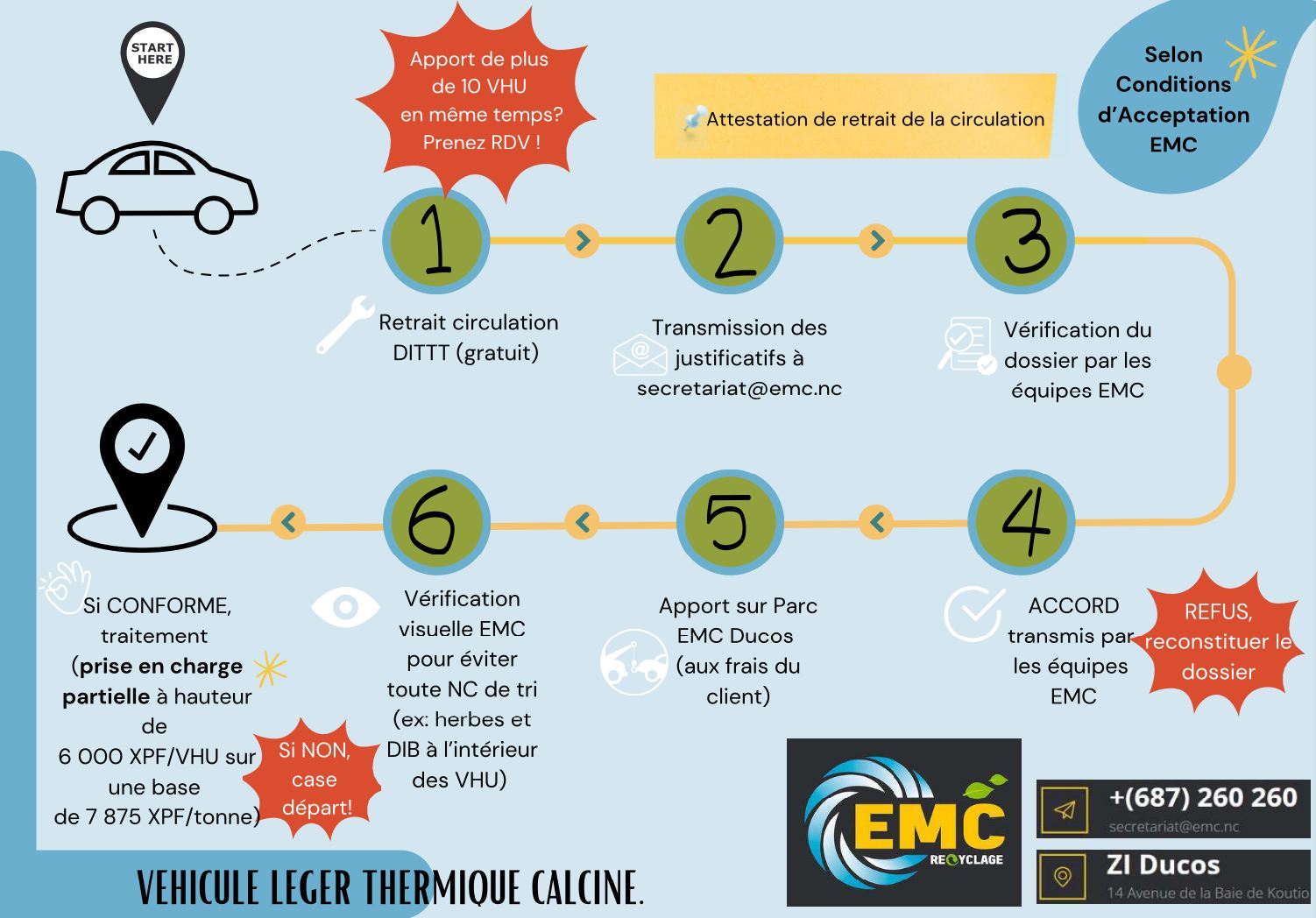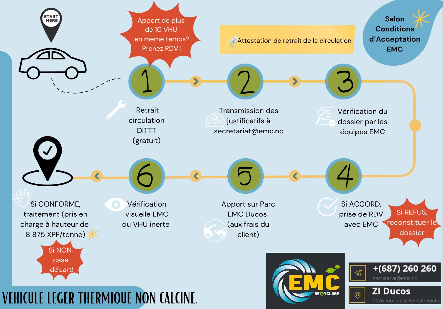 Chez EMC, nous avons mis en place des flyers explicatifs pour vous aider à mieux comprendre les procédures d’acceptation et de traitement des VHU (Véhicules Hors d’Usage) selon leur type.